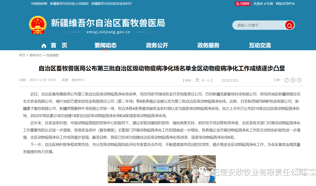 2023年12月,自治區(qū)畜牧獸醫(yī)局第三批自治區(qū)級動物疫病凈化場名單公布,巴楚公司第二羊場獲此殊榮。三年多來,在農(nóng)業(yè)農(nóng)村部、中國動物疫病預(yù)防控制中心的指導(dǎo)下,巴楚安欣通過采取加強組織管理、爭取政策支持、抓好技術(shù)培訓(xùn)等有效舉措,公司養(yǎng)殖場區(qū)對動物疫病凈化工作的措施進一步細(xì)化,出色完成動物疫病凈化工作,提升全公司動物疫病防控整體水平,為全區(qū)動物疫病凈化工作積累成功經(jīng)驗。安欣牧業(yè)必將不斷提高宣傳培訓(xùn)的實效性,穩(wěn)步推進全區(qū)動物疫病凈化工作,為全區(qū)畜物業(yè)高質(zhì)量發(fā)展提供有力支撐。